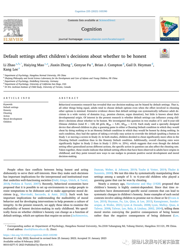 近日,杭州师范大学婴幼儿发展与托育实验室(浙江省哲学社会科学培育实验室)主任赵立教授及其团队的研究成果“Default settings affect children’s decisions about whether to be honest”在国际心理学知名期刊Cognition上发表。该研究首次揭示环境中默认设置会影响幼儿的诚信行为。
